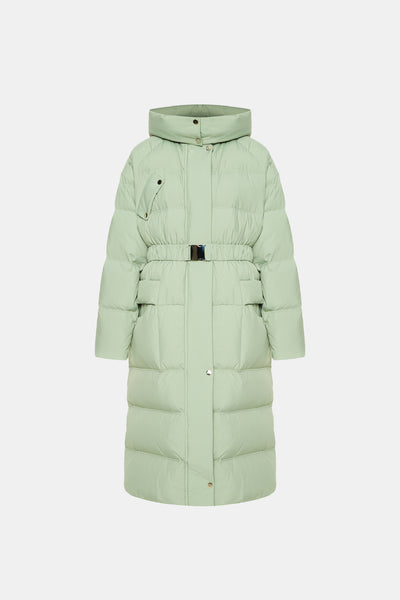 - Design elements: double slider zipper with hidden snap placket, detachable hood with deep cuff, additional inner cuffs, and elasticated belt for flattering waist definition