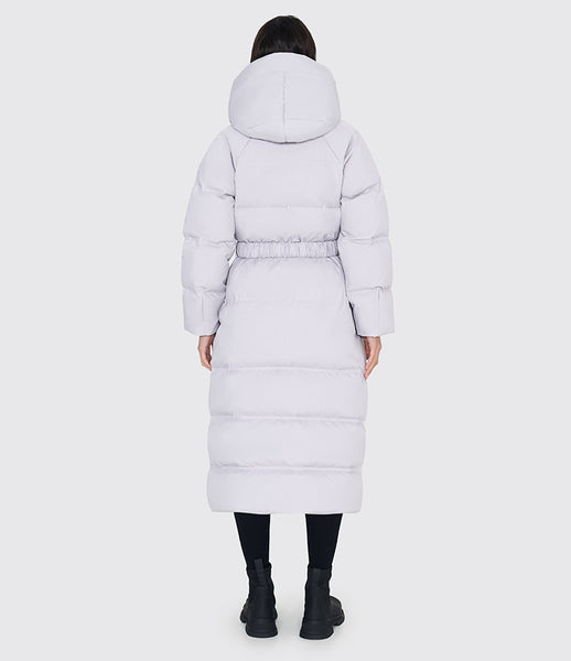 • Design elements: double slider zipper with hidden snap placket, detachable hood with deep cuff, additional inner cuffs, and elasticated belt for flattering waist definition