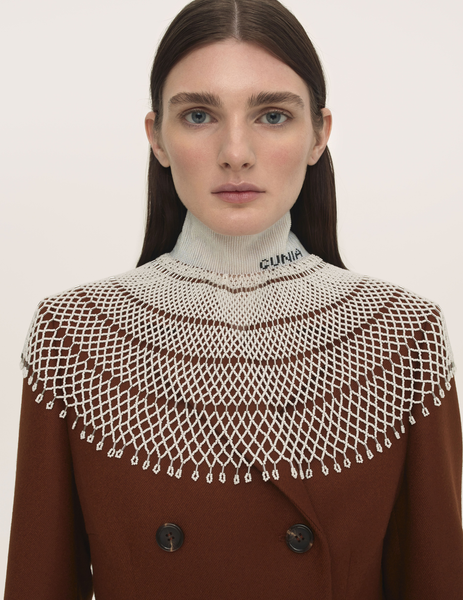 Kryza este o piesă tradițională de bijuterie, specifică regiunii Lemkivshchyna în secolele XIX și XX. Acest colier lat din mărgele, modelat sub forma unui guler, acoperă gâtul, umerii și pieptul. Kryza de la GUNIA Project este realizată manual de meșteșugărițe talentate din Zaporizhzhia. Crearea ornamentelor cu motive geometrice necesită până la 8 ore de muncă și un număr inestimabil de mărgele.