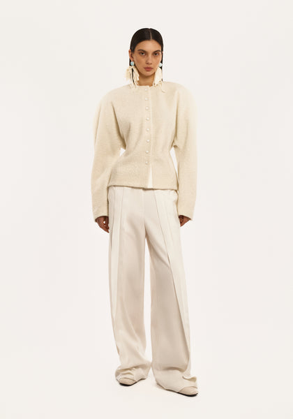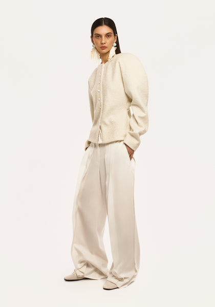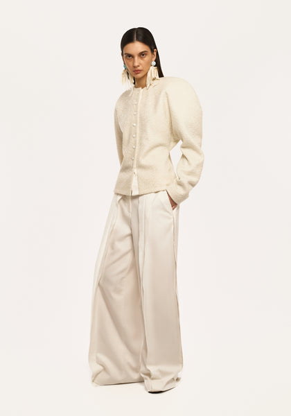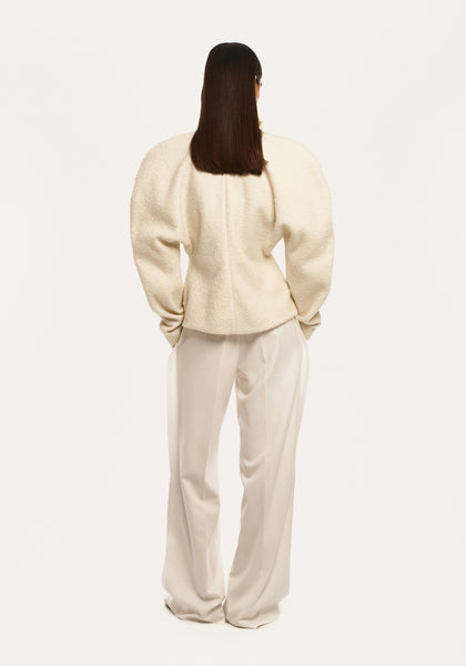 **Jacheta Tricotată Albă** de la Bobkova îmbină o croială structurată cu detalii dramatice. Cu mâneci voluminoase și închidere cu nasturi, această piesă este realizată cu grijă și creată pentru a aduce împreună structură și finețe. Este perfectă pentru a eleva un look în straturi sau pentru a deveni piesa centrală a ținutei.