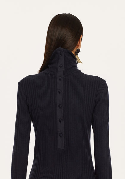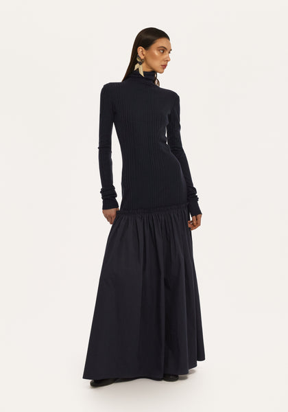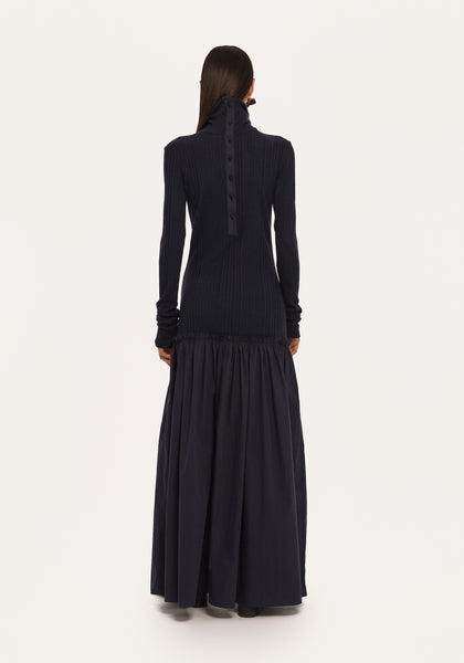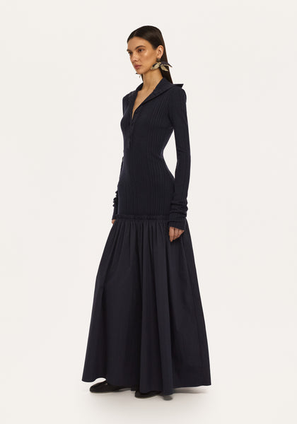 Îmbinând armonios finețea cu structura, **Rochia Tutu Albastru Închis** de la Bobkova prezintă un top tricotat mulat, asociat cu o fustă tutu voluminoasă din bumbac. Gulerul întors și închiderea tip polo cu nasturi adaugă un aer rafinat, în timp ce silueta dramatică o face perfectă pentru ocazii speciale sau ținute statement.